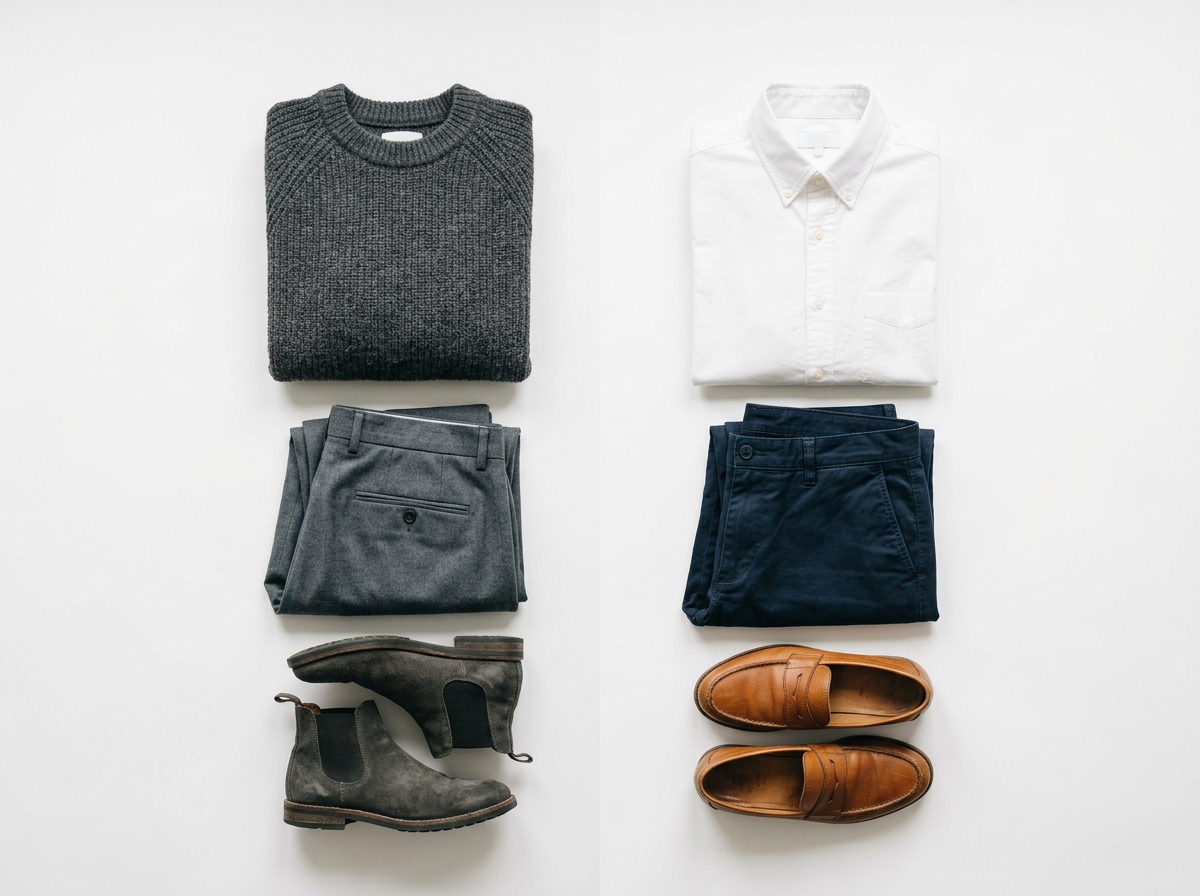 Forgetting shoes. Footwear is where most formula outfits are won or lost. The wrong shoes can undercut an otherwise sharp outfit. Keep three to four pairs in rotation that each serve a different level of formality: clean trainers, suede loafers or derbies, and one pair of boots. That covers every formula.