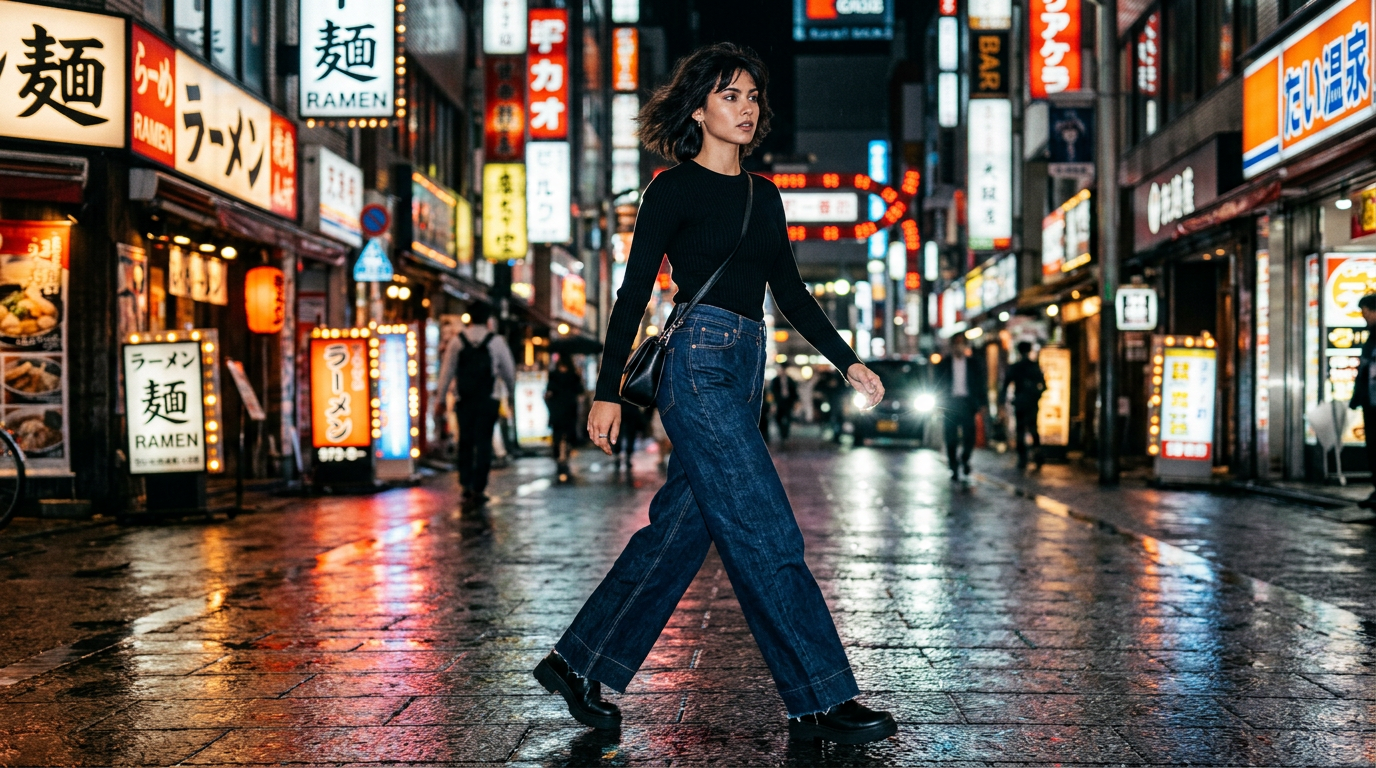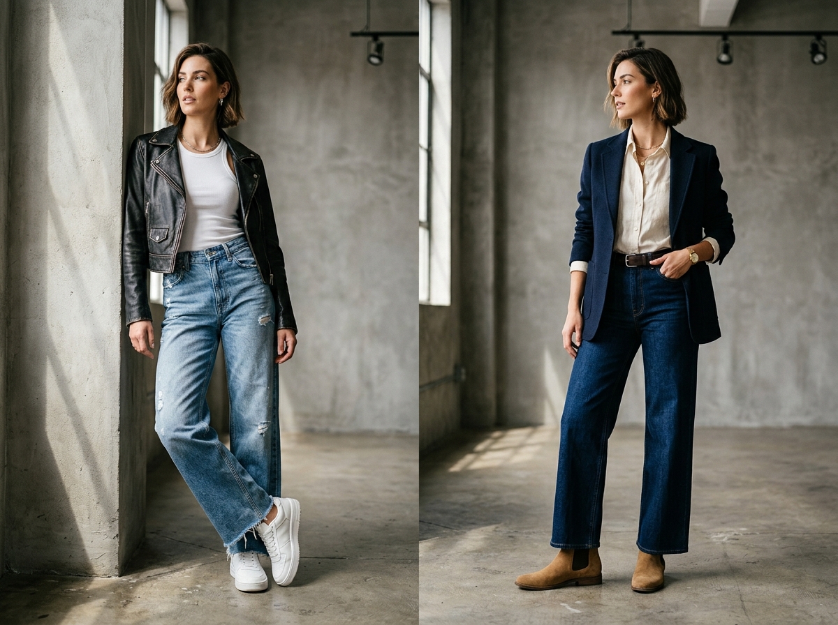 Взуття з wide-leg джинсами — це місце, де більшість образів провалюється. Підшив wide-leg падає інакше, ніж у slim чи straight, і взуття визначає, чи низ образу виглядає чисто чи хаотично.