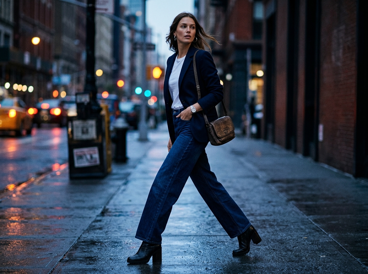 4. Blazer move. Темно-синій приталений блейзер + кремова заправлена футболка + чорні wide-leg джинси + чорні шкіряні черевики. Образ, від якого питають, куди ви зібрались. Блейзер піднімає, wide джинси не дають зайти у формал, а тональна послідовність внизу (чорні джинси + чорні черевики) створює довгу чисту лінію ноги попри ширину.